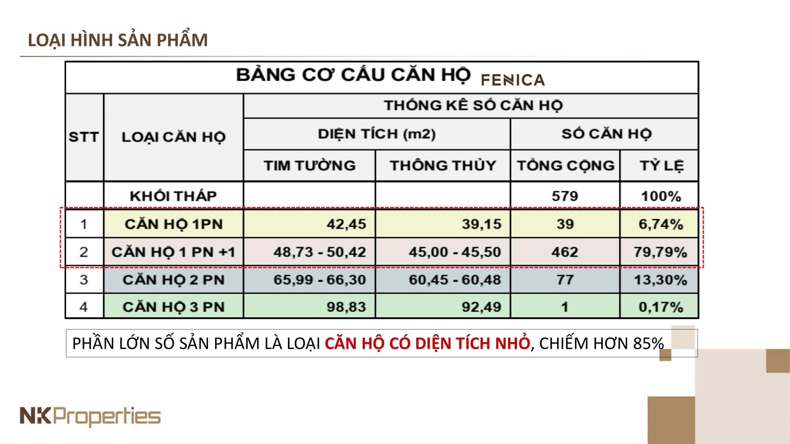 Diện tích phổ biến: 45m² – 65m², loại hình 1PN, 1PN+ và 2PN